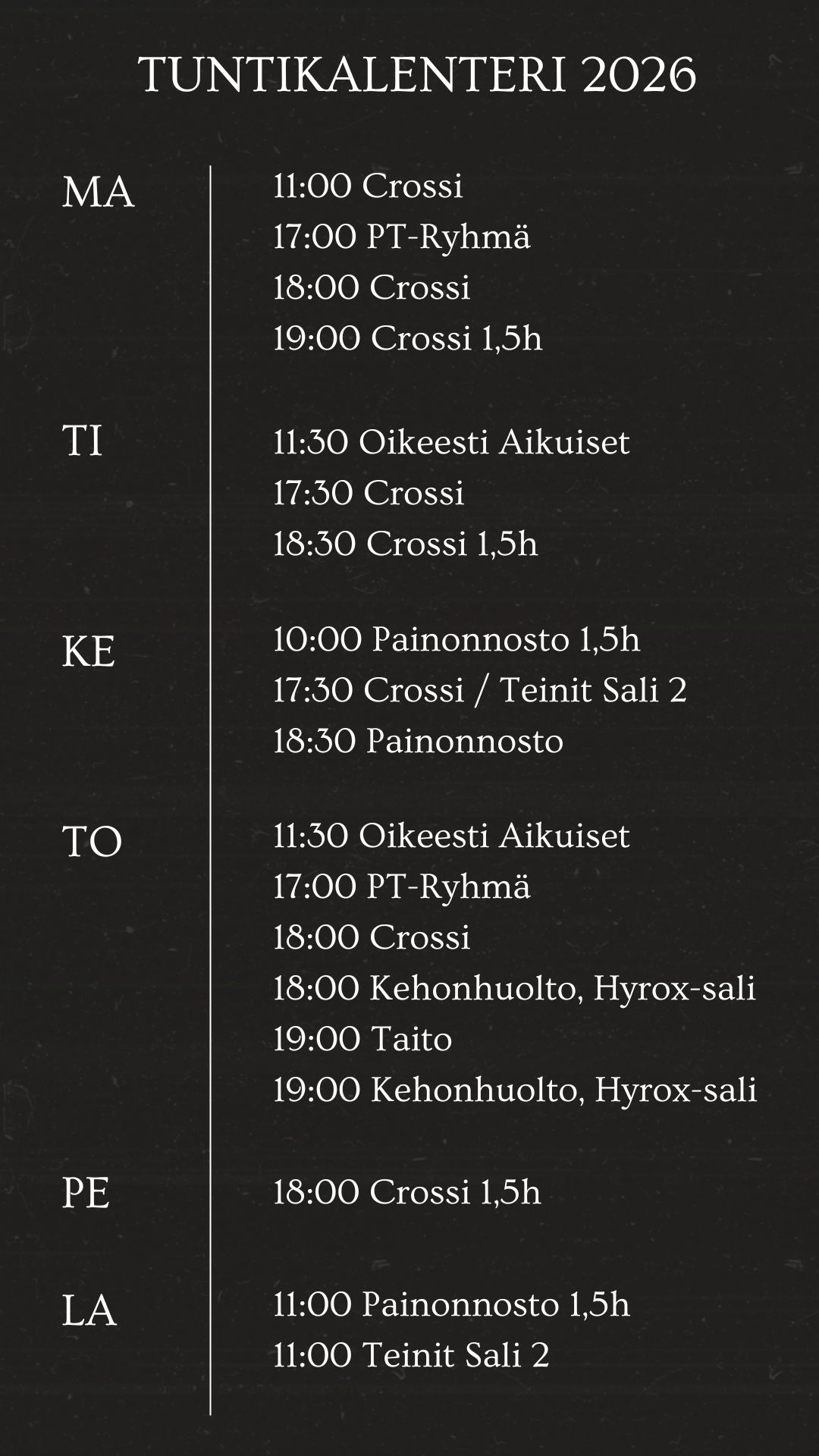 Teurastamolla on tarjolla ohjattuja treenejä kuutena päivänä viikossa, treenit ovat 1-1,5h mittaisia. Open Boxilla voit käydä treenaamassa omatoimisesti joka päivä klo 6-23 välillä. Seuraava aloituskurssi on 18.1.2026. Varaa paikkasi klikkaamalla tästä.
