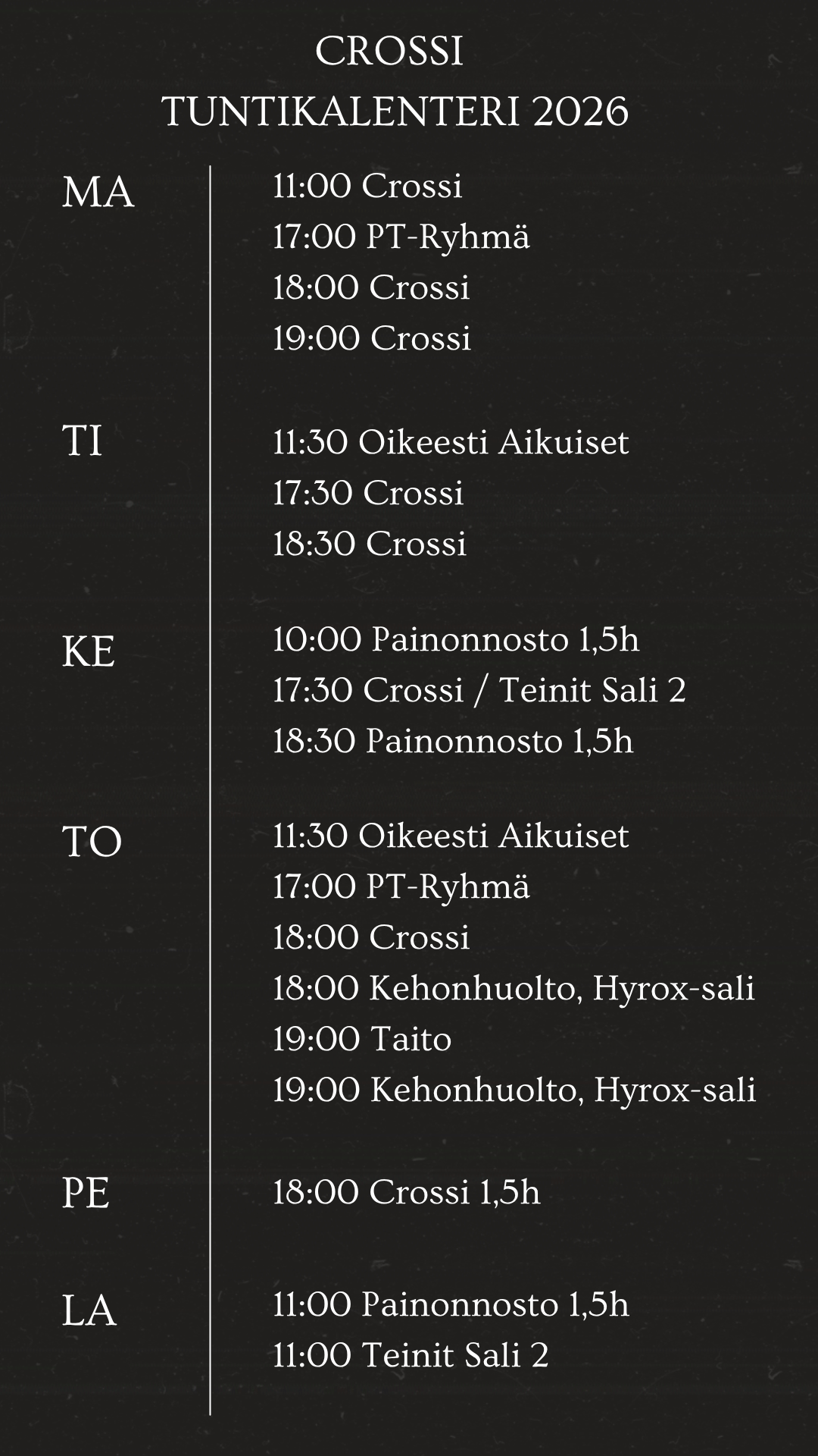 Teurastamolla järjestetään ohjattuja treenejä kuutena päivänä viikossa, treenikerrat kestävät 1–1,5 tuntia. Open Boxilla voi treenata omatoimisesti joka päivä klo 6–23. Seuraava aloituskurssi järjestetään 12.4.2026. Paikan voi varata klikkaamalla tästä.